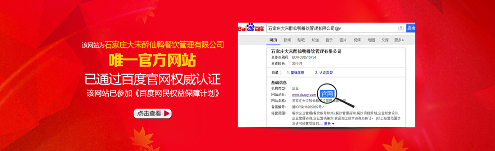 石家莊大宋醉仙鴨餐飲管理有限公司是以大宋醉仙鴨為主導,集武漢精武鴨脖系列,大宋千年燒雞系列,炸雞烤雞系列,熏肉系列等十幾種熟食為一體的品牌管理公司。 大宋醉仙鴨,在宋代祖?zhèn)髋浞降幕A上結合現(xiàn)代的口味,集多家熟食經(jīng)典潛心研究多年,1998年開了第一家“大宋醉仙鴨”專營店,口味馬上得到消費者認可,信賴。在以后的發(fā)展中在逐步得到全國消費者的驗證。